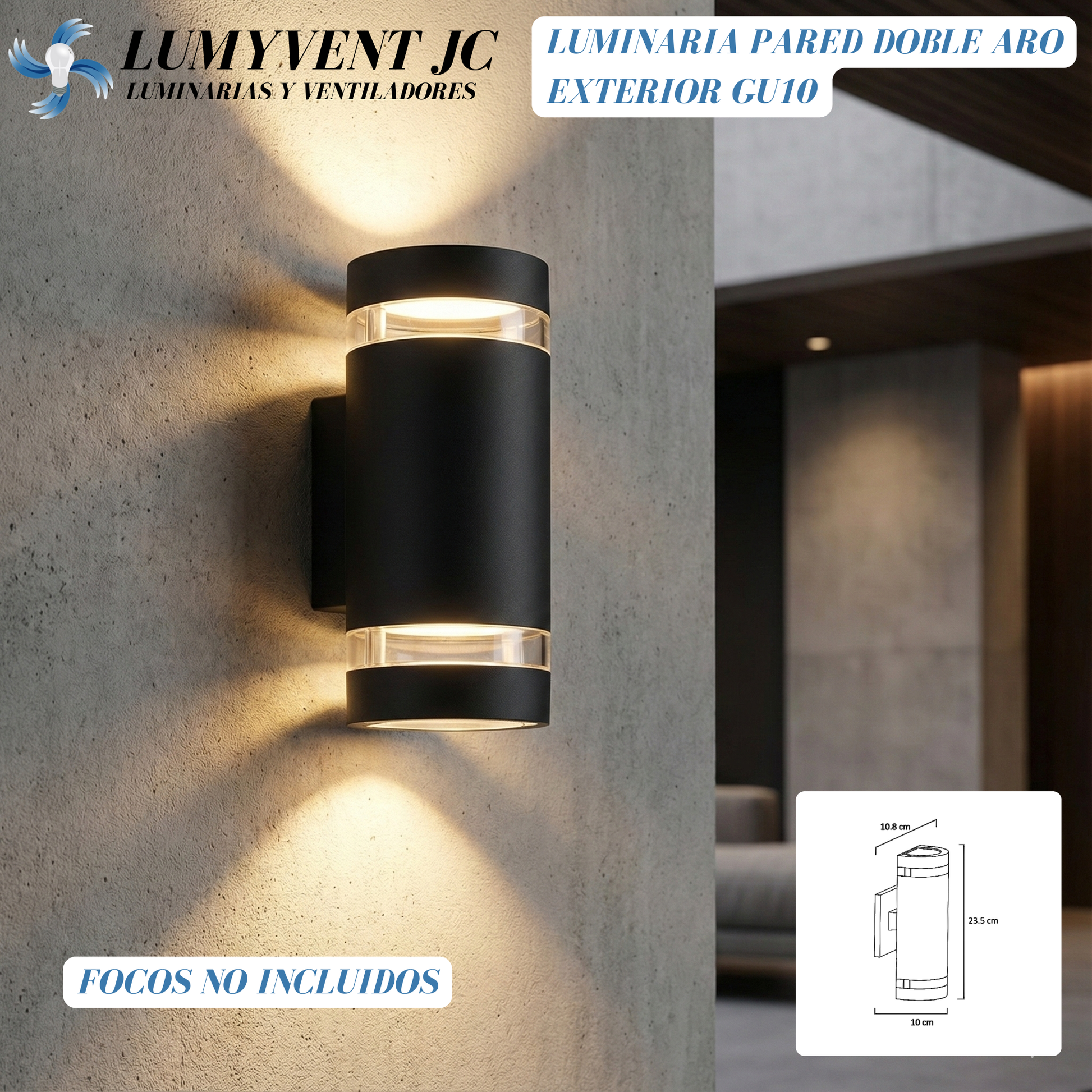 LUMINARIA PARED CILINDRO ALUMINIO NEGRA DOBLE ARO EXTERIOR BASES GU10